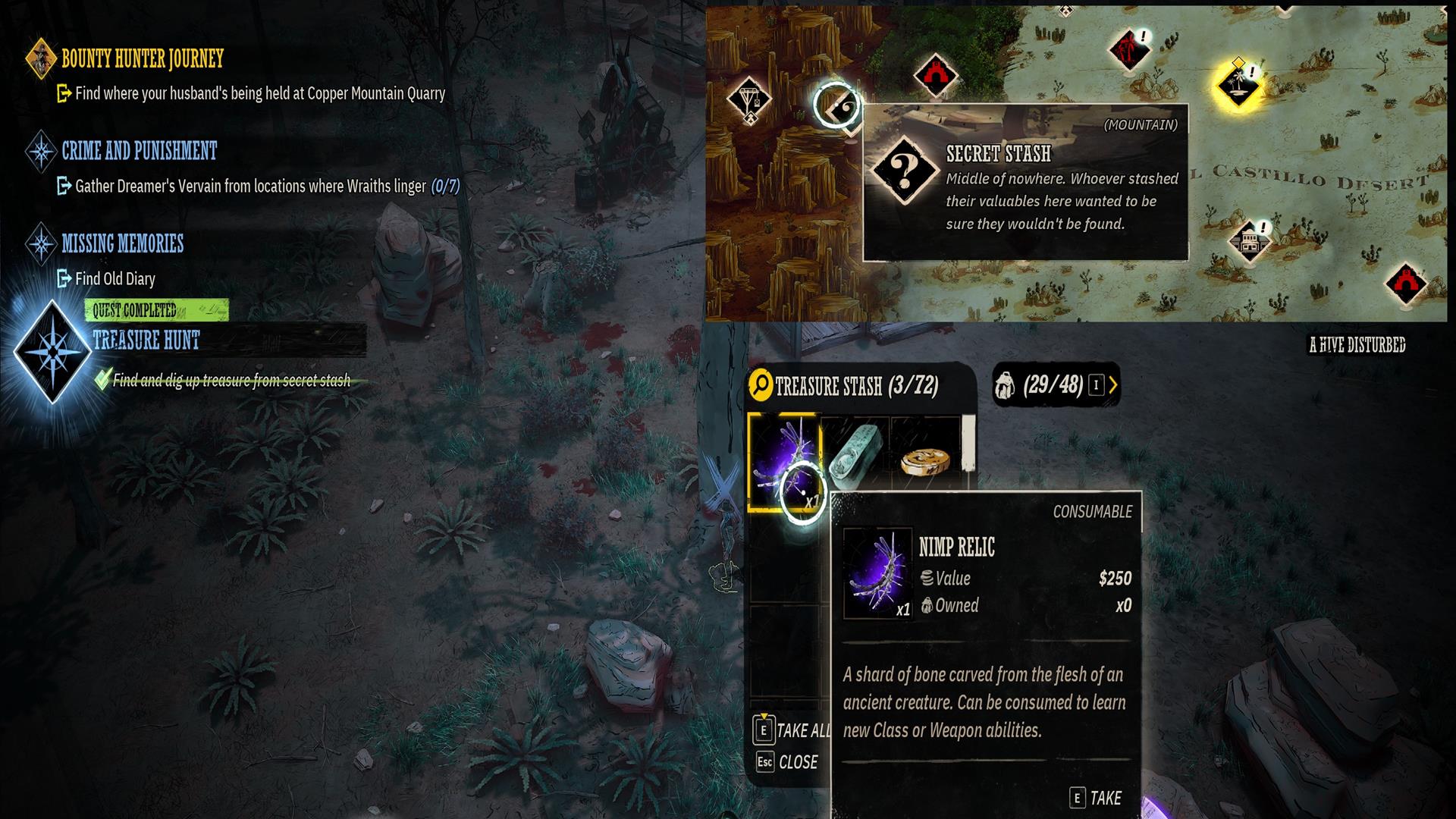 Next, look for the a tree or a rock with an “X” marking. Use your shovel (hopefully, you have one with you) to dig the mound. You should then find the Secret Stash for the Treasure Hunt in Weird West. These caches might have Nimp Relics for your abilities, Golden Aces of Spades for your perks, or nuggets/bars for equipment upgrades.