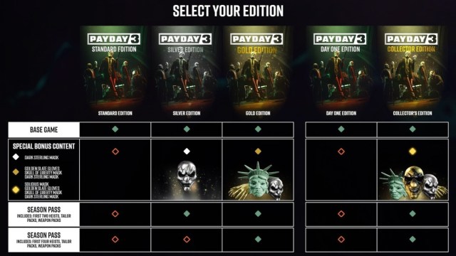 There are five Payday 3 editions to choose from. The Standard, Silver, and Gold Editions are digital-exclusive and the Day One and Collector Edition are physical-exclusive. Some offer the season passes, others offer special cosmetics, but all of them get you full access to Payday 3.