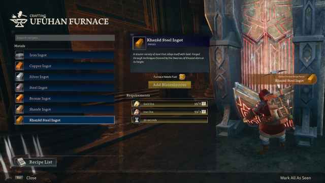 To unlock the Khuzdul Forge blueprint, you must light the Great Belegost Forge. This will allow you to smelt new ingots in your furnace back at home, as well as forge better weapons, tools, and armor. Once this is done, smelt some Shanor Ingots in your furnace back home. Upon collecting them from the furnace, even if you have found some in Moria already, you’ll unlock the building recipes for the Khuzdul Forge and the Ufuhan Furnace.