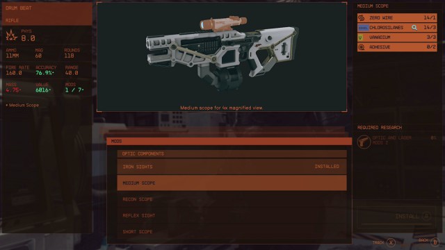 For example, there’s a rifle you get from enemies pretty early called the Lawgiver, and this is a semi-automatic rifle that deals some decent damage. You can equip a short scope onto this for some magnification, and then a suppressor if you want to stay quiet too, and it essentially becomes a mid-range sniper rifle in Starfield.
