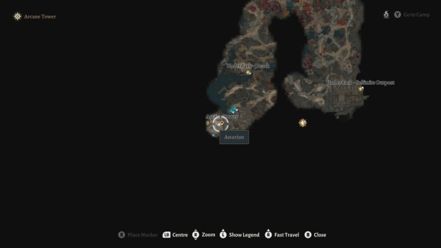 You can approach the Arcane Tower a number of ways. It rises over the western portion of the Underdark, a long journey west from the Selunite Outpost. See the above map screenshot, which shows Astarion’s location at the front door.