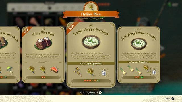 Once you have all three ingredients, you can cook them all together to make Sunny Veggie Porridge which you can use to complete the Gloom-Borne Illness Side Quest. You can also make more Sunny Veggie Porridge as not only restores three hearts, but also restores three hearts lost to the gloom.