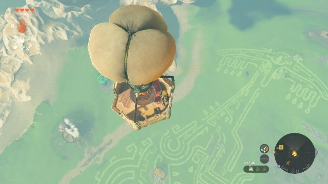 Use the Ultrahand ability to lift the balloon on top of the basket. Once attached, get inside, start the fire, and the balloon will take off. The Geoglyph seems to be a drawing of a Zonai. Impa then tells you she’s looking for a Dragon’s Tear, which is easier to spot from high up. When you’re ready, jump off the hot air balloon, and fly towards the head of the Zonai Geoglyph.