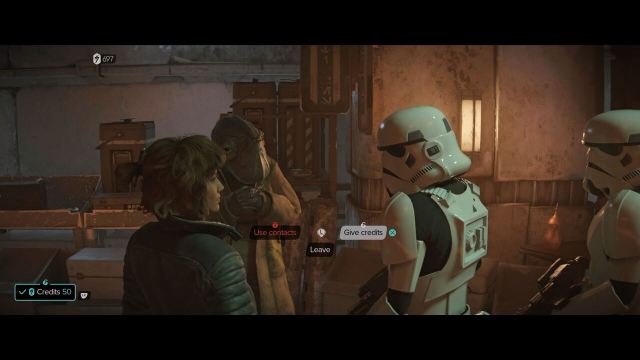 After shopping with Jonkah Rremset, two Imperial Guards come over and demand Rremset pay for illegal marketing. He claims he doesn’t have the Credits (which is a lie because we just paid him), so you can either use your contacts if you have them or pay 50 Credits to the Imps to satisfy their demands.