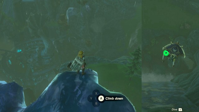 To know where to find King Dorephan, you can follow the map above. You’re going to need to head to this location, the shrine at the top of Zora’s Domain is the closest fast travel point to the hideaway where King Dorephan is, so fast travel there if you have it. Once you arrive here, head backwards, away from the shrine, and towards the cliff. Glide down towards the left, and past the concrete on the edge of the cliff below the one you jumped from.
