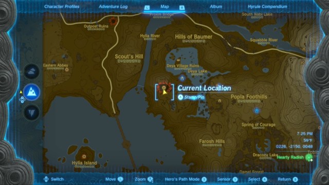 If you want to reach Spirit Temple before the story campaign provides you a guided tour, you’ll need to approach from a different nearby chasm. The Hills of Baumer Chasm is a good option. Refer to the screenshot below to find that chasm’s overworld entrance. It lies west from Popla Foothills Skyview Tower.