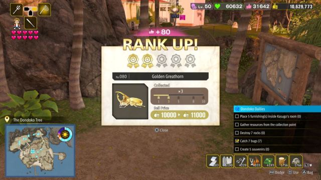 One of the rarer insects on Dondoko Island is the Golden Greathorn, which I didn’t even find until I had upgraded the Bug Net. From what I can tell, there is only one place on the main island where you can find the prize. Look for the Golden Greathorn on The Dondoko Tree.