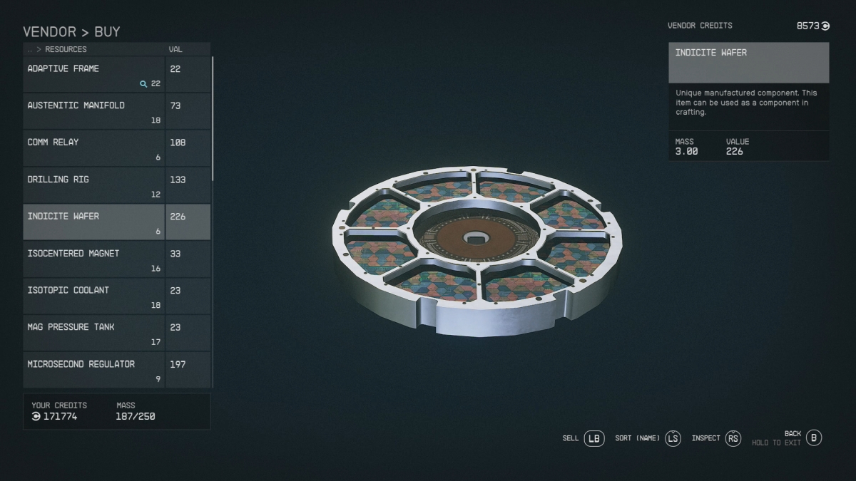 You’ll need Indicite Wafer to research Helmet Mods 3, Spacesuit Mods 3, and probably other things, too. However, it’s one of the least common resources available. To get Indicite Wafer, purchase it from general stores that sell resources.