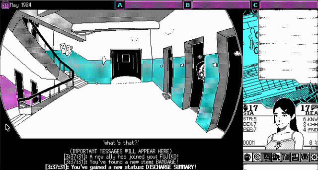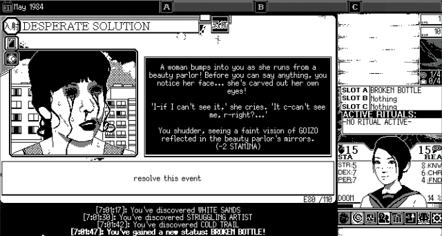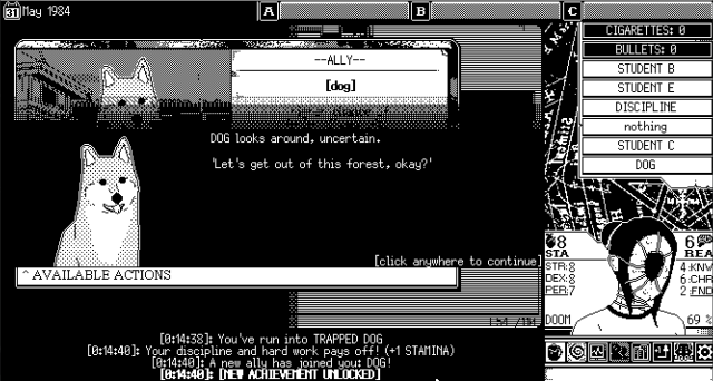 Regardless, that’s a pretty good summary of how World of Horror plays. The difference is, in place of love, you’re trying to stop eldritch abominations from awakening and eating the world. It’s a roguelite, presented in a 1-bit style, emulating the look and feel of adventure games on some very retro computers.