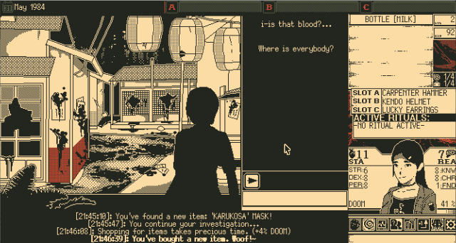 Aside from those retro titles, World of Horror‘s building blocks are very clearly the works of Lovecraft and Junji Ito. Weird things are afoot in the Japanese city of Shiokawa in the year 198X. Cults are holding strange rituals, people are disappearing, and an old god is awakening to claim the Earth. And you – as one of five playable characters – are the only one who can stop it.