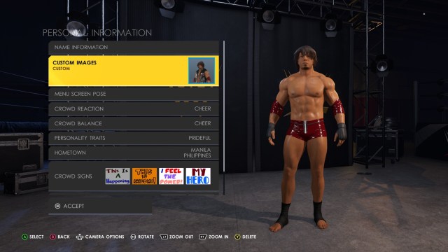 If you want yourself to be part of the action, then it’s very unlikely that you’ve got a wrestling or cosplay attire lying around. The best you can do is upload your face photo when you make a custom superstar.