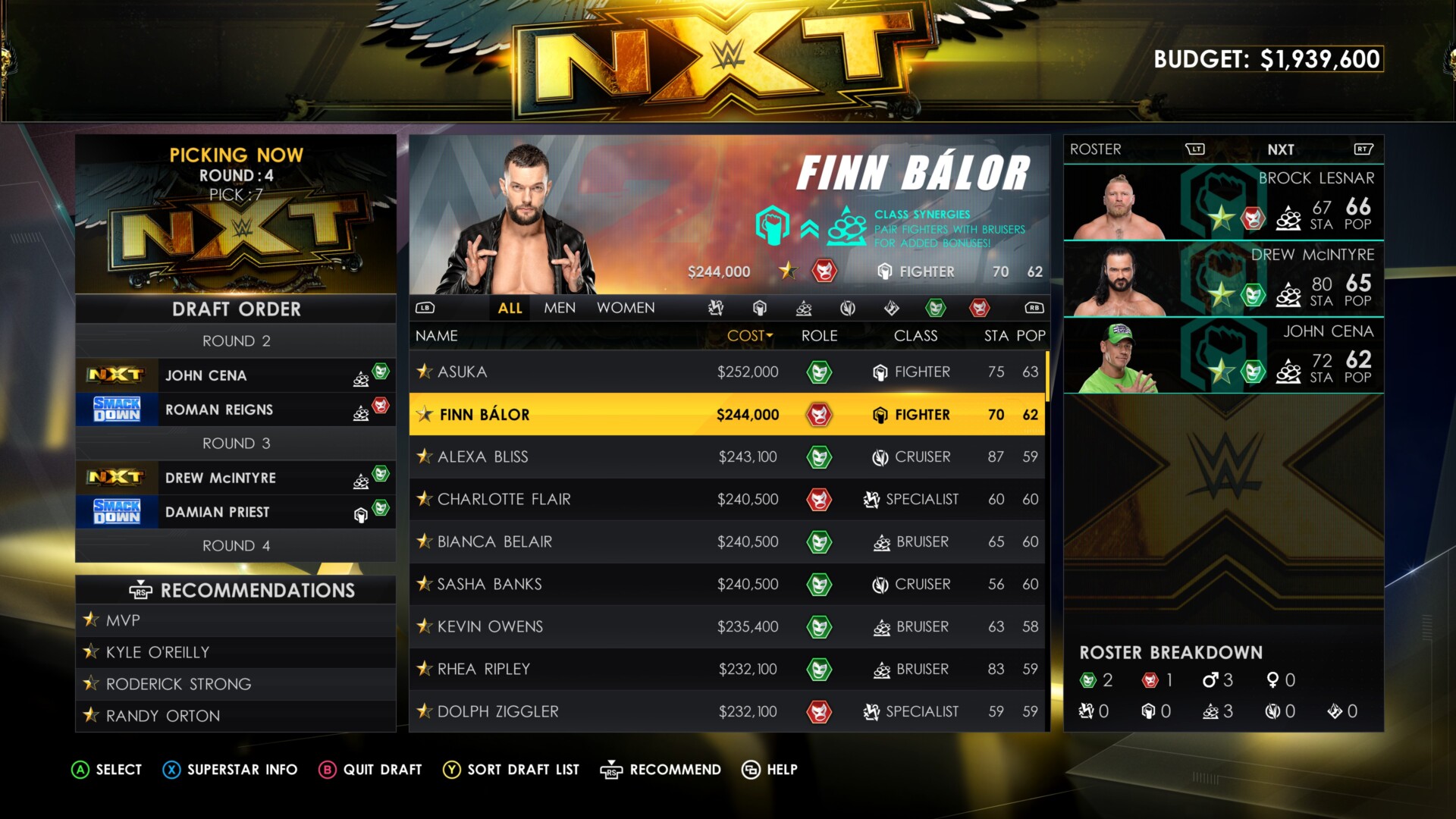As for WWE 2K22‘s draft in MyGM mode, you and your opponent will take turns alternating when choosing wrestlers to join your roster. Pay attention to the following: