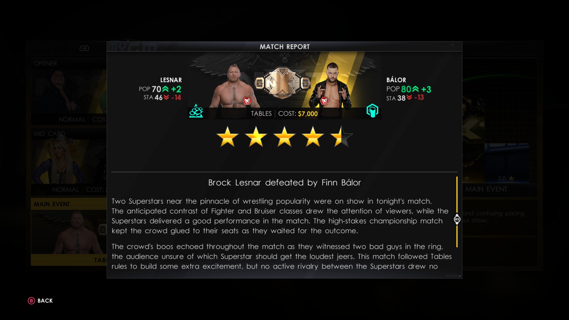 - At the conclusion of each week, you’ll see how much money you earned, how many fans you gained, and the ratings of each match. You and your rival will also be judged accordingly depending on how many fans tuned in to your respective shows.