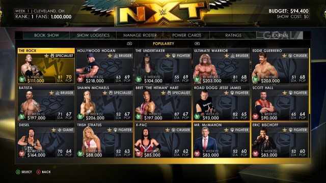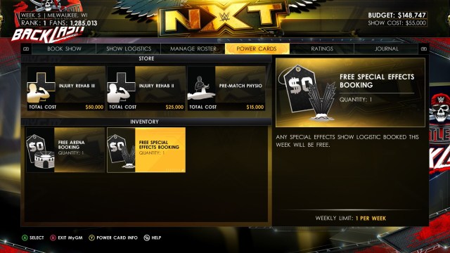 The Journal tab tells you if Triple H, who acts as the commissioner for all brands, has a particular objective. For instance, he might want you to book a certain wrestler. Alternatively, he might tell you not to book them. He could also ask for a specific match stipulation that week. Completing this task nets you an extra Power Card.