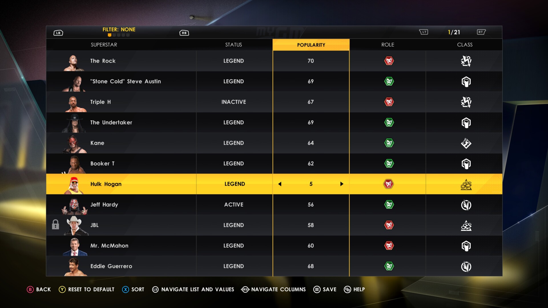 - Status – Active, inactive, or if they’re considered legends (more on this later). This is also where you can toggle created superstars/CAWs if you want them to appear.