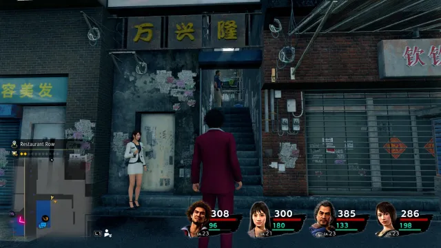 I’m pretty sure you need to be a ways into chapter 6 to get a pic of this Kappa statue, so bear that in mind. First, head to Zhou Long Distribution on the map. It’s just north of the movie theater, or if you prefer, the taxi on Restaurant Row. Just north of Zhou Long Distribution is a little alleyway leading east. Just where the blue border of the shop ends in this alley, there’s a set of stairs going upwards which are not marked on the map: you’ll proceed up these at one point in chapter 6. Again, there’s another screenshot here to clarify exactly where that is.