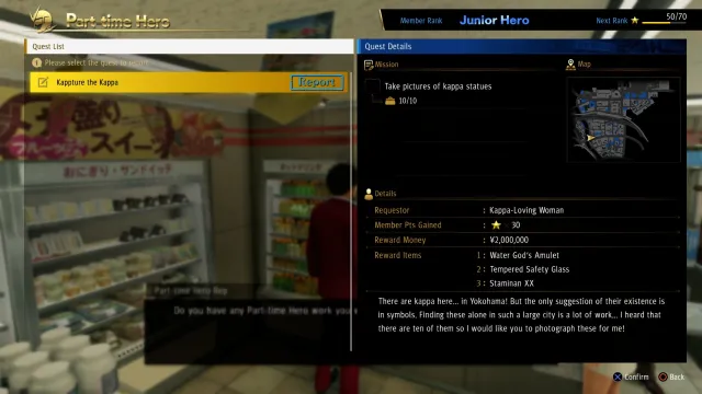 This is available via the Part-Time Hero app as early as chapter 5, but you can’t access all of the Kappas until chapter 7. However, the rewards include a cool 2 million yen, which is a hefty chunk of money at any point of the game. What you need to do is find 10 Kappa statues hidden around the city and snap photos of them. In this instance, “hidden” is not a lie: one or two are fairly easy to find, but some of them are complete bastards.