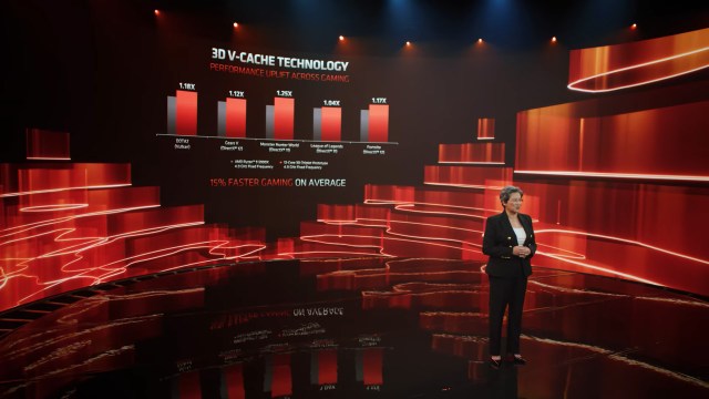 The prototype shown off in the presentation was a Ryzen 5900X based on the Zen 3 architecture. The key difference was that the prototype featured 3D-stacked CCD on top of the existing cache, which brings the total L3 cache of the CPU up to 192MB over the previous 64MB. By tripling the cache with speedy Static Random Access Memory (SRAM), AMD managed to effectively boost the gaming performance of the chip by an average of 15%. Considering how that’s the level of performance uplift that we typically get out of an entirely new generation, this breakthrough is impressive.
