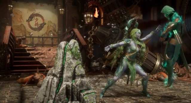 The reveal came out of a GameInformer video today. In the clip, Jade finds herself seriously mismatched against the angry goddess — whose “mother nature” look seems like a nod to Poison Ivy. In a grab move, Cetrion summons a rock from the ground and introduces her new friend to Jade’s face. Repeatedly. Cetrion also pulls rocks from below to hurl at her opponent, as well as brings forth small twisters as a stun move. We also see her using water to trap Sonya, only to freeze her and drop her the ground.