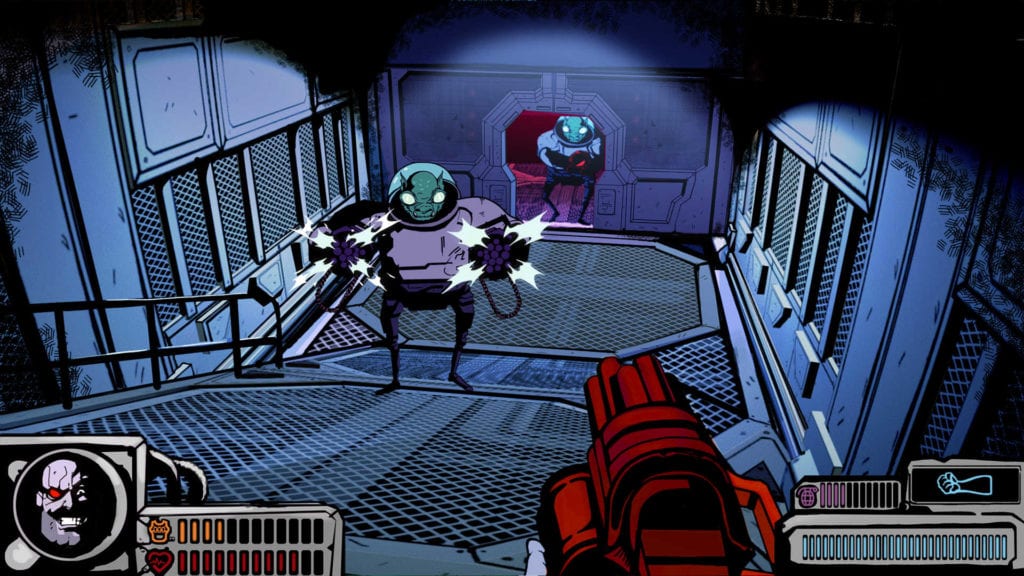 The game’s art design draws heavily from older comic books, mixing 2D enemies with 3D environments. It even features comic-appropriate bubbles, such as little explosions when you punch an alien or blast a robot with a double-barrelled shotgun. Chains of Fury’s creator, Krzysztof Orzędowski, says that some of the inspirations behind the game are “the cult comic series Lobo and Hellboy as well as drawings by Mike Mignola.” It certainly seems to capture Mignola’s muted but varied color palette with a heavy dose of black shading.
