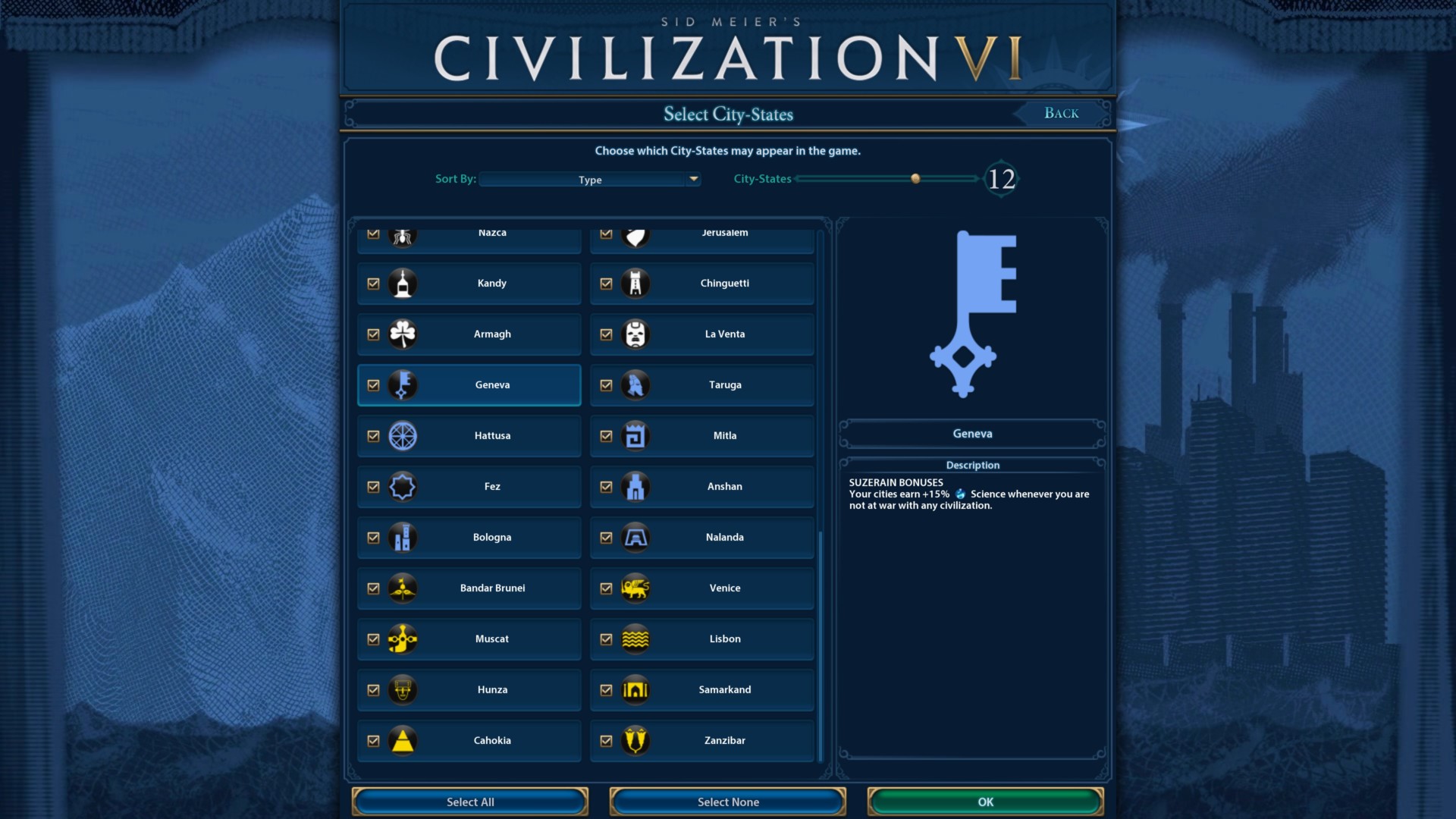 From this screen, you can choose which city-states would pop up as you’re playing on the map. Would you like the most overpowered ones, praying that you’ll be the first to spot them? Or would you prefer focusing on a particular type such as Religious, Militaristic, Industrial, and the like?