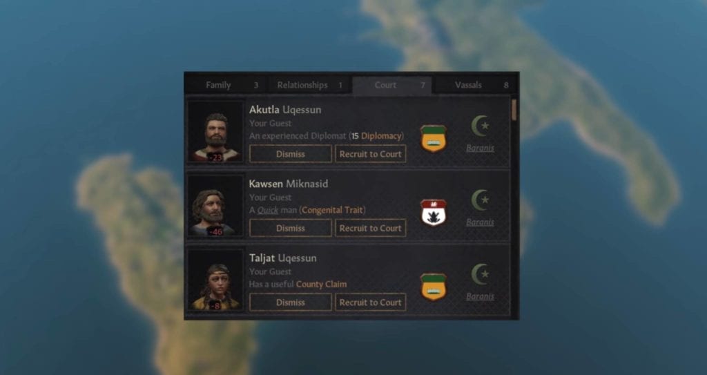 In Crusader Kings III, wandering characters will simply count as guests. You can’t order them around, and they’ll only stay for a couple of years. If they do catch your eye, you could recruit them to your court, finally turning them into courtiers. You could also turn them into vassals immediately if you grant them landed titles.