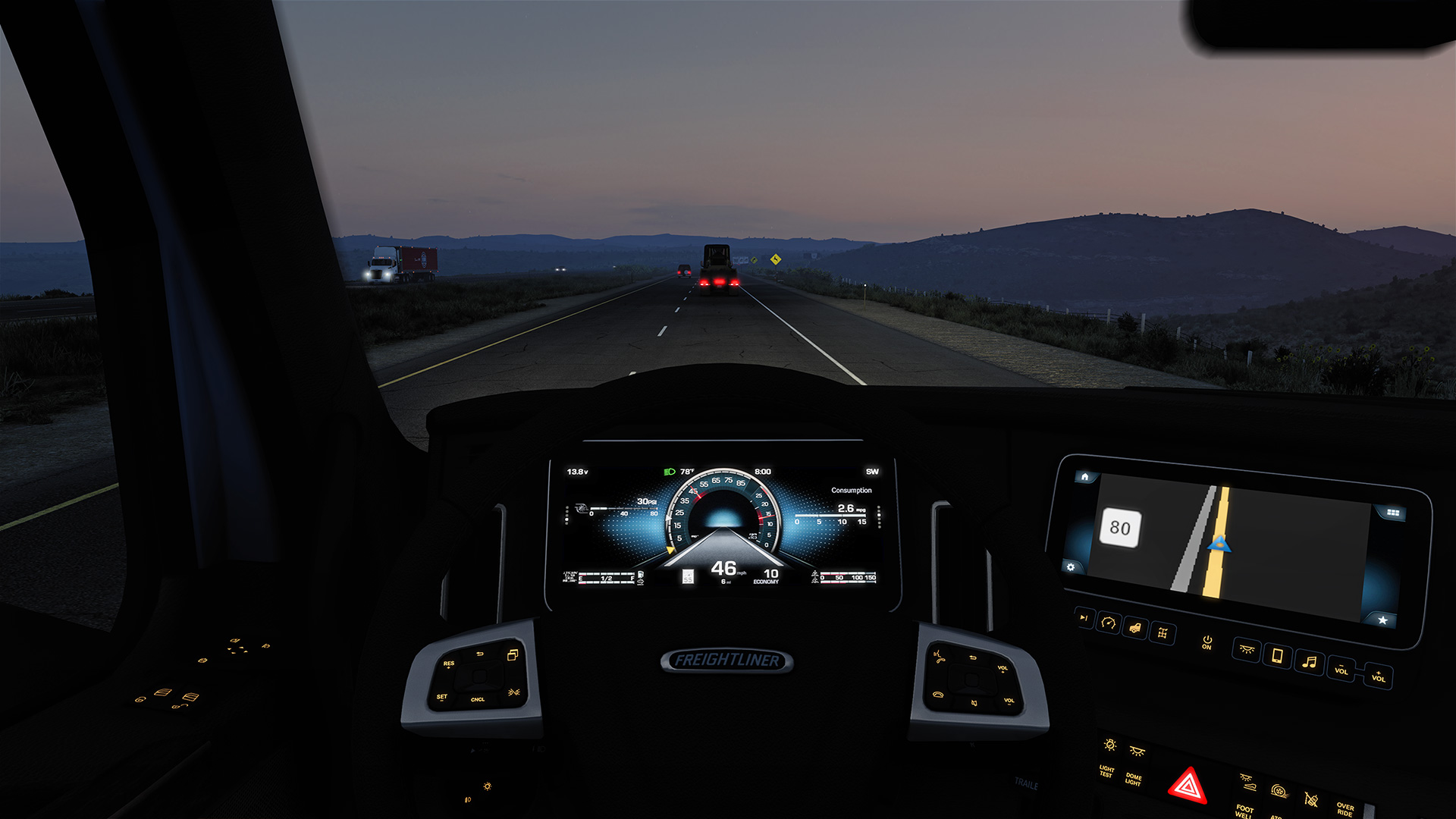 The list of specific updates for American Truck Simulator is a bit thinner. Really, the only exclusive update is that the 2022 Freightliner Cascadia has some new parts and customization options, including a revamped interior and exterior changes. It does feature a fancy new all-digital dashboard; no Tesla Semi, but still futuristic.