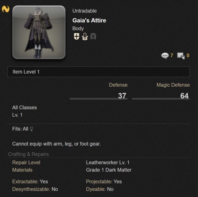 This is likely because Gaia’s character model is vastly different from other characters in the game. Typically, NPC characters in FFXIV are built using a slightly modified version of the character creator and given unique clothing that works with the current apparel system. This is why many of the purchasable items in the shop come as separate pieces. For instance, Y’shtola’s Heavensward and Shadowbringers gear on the Item Store are all separate pieces.