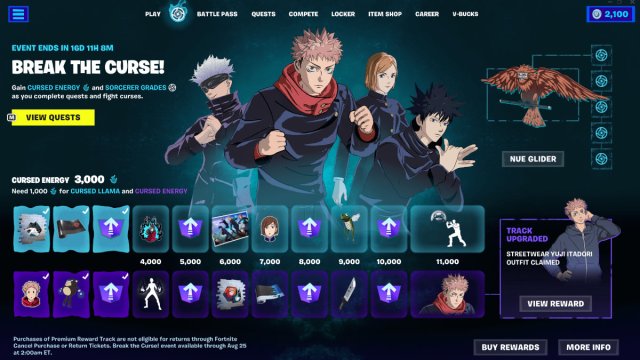 There’s one last key thing to know about the Fortnite Jujutsu Kaisen Break the Curse event passes. There are multiple timed Grade levels you can unlock, and the Nue Glider is a special reward for getting through all four.