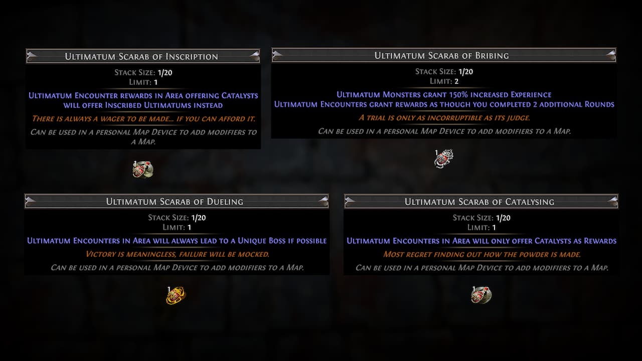 - Scarab changes: Scarabs now feature different variations that will help cover a good chunk of map variety presented by previous content. You can also use Remarkable Relics and Tainted Carapaces to focus your attention on farming a specific type of Ultimatum Scarab.