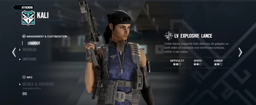 Kali’s rifle also features an under-barrel launcher equipped with her signature gadget: three rounds of the LV Explosive Lance. This bad mamajama burrows into both reinforced and unreinforced walls. Once lodged, it will trigger an explosive blast on both sides of the wall, destroying any gadgets, Castle barricades, or deployable shields around. The gadget and gun combo place her solidly as an alternative to Glaz, Ash, Zofia, and Thatcher.