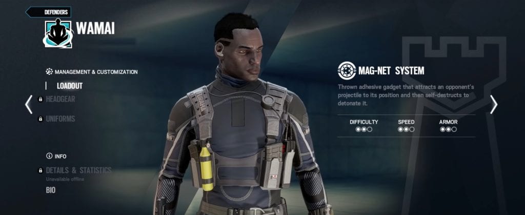 Also weighing in with a 2 speed/2 armor is Siege‘s latest defender, Wamai. He is designed as an alternative for the heavily picked Jager. His gadget is the Mag-Net System, a throwable sticky emplacement that will pull any attacker grenades and non-bullet projectiles in towards itself. Any projectiles’ detonation timer is reset when caught. Instead of blowing up where the attackers planned, throwables will go off inside the Mag-Net, destroying both. Wamai gets his Mag-Nets on a timer, similar to how Legion works. This should help players pace out their gadget use and keep him strong in late round gameplay.