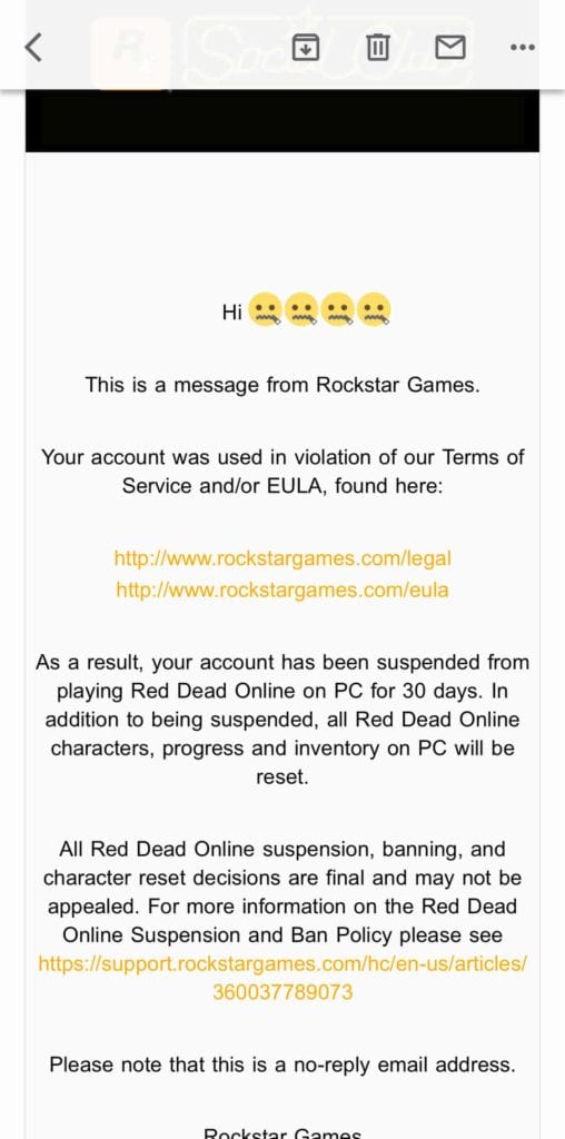 An anonymous source sent a screenshot to RDR2.org showing that Rockstar banned their account for 30 days. Additionally, their progression, characters, and inventory were reset. Furthermore, the email clarified that bannings are “final and may not be appealed.”