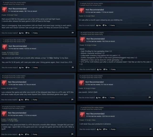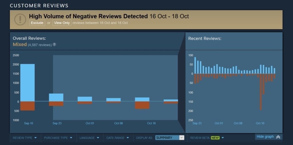 These and many others are actually fairly telling because some of these players have either (a) spent dozens of hours in the game when it initially launched; (b) did not spend a lot of time on the game at all. The common threads that bind these players are that they haven’t played in the past couple of weeks and that they all bought the game earlier than the rest. They were not expecting the price to drop so soon. Henceforth, review bombing was the only option to let their voice be heard.