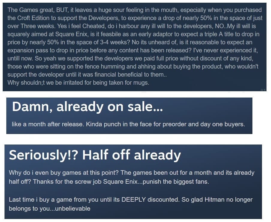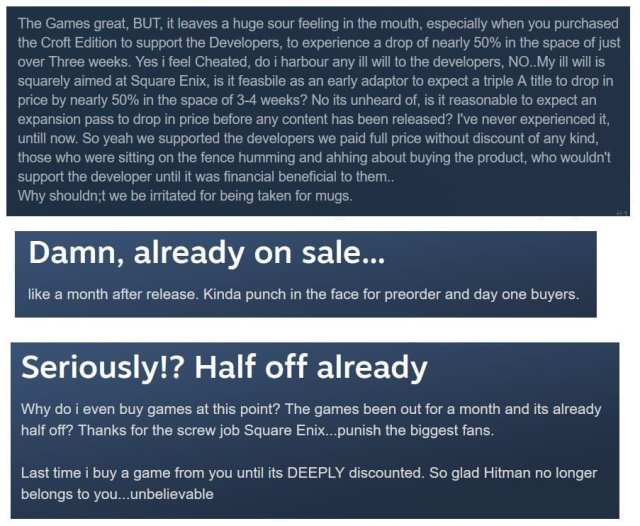 Fans angrily review bomb Shadow of the Tomb Raider on Steam after it went on sale just a month after launch. This was seen as disrespectful to those who pre-ordered the game or bought it early.