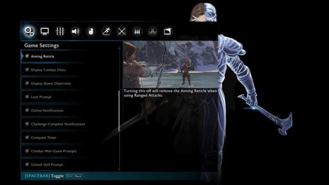 I’ve merged a couple together here. ‘Input’ deals with mouse (or controller) sensitivity, aim assistance, camera inversion and the like, while ‘Bindings’ (as you may guess) is all about rebinding the input keys. Helpfully, when you do the latter, it also tells you what other input actions you’re changing by moving (say) ‘Sprint’ off the space bar.