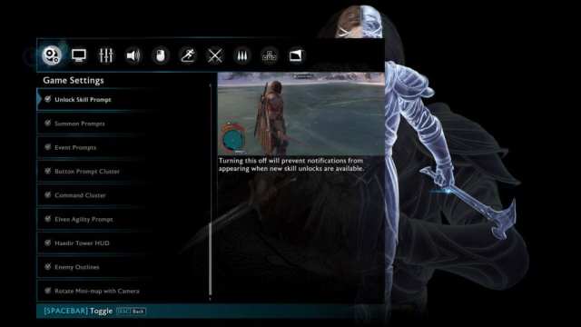 A lot of great stuff to toggle here, like whether enemies display counter-attack prompts over their heads (with or without specific button prompts, or not at all). Shadow of War also displays an image of the UI aspect it’s talking about next to each option, so you can see exactly what a scene looks like with it on or off.