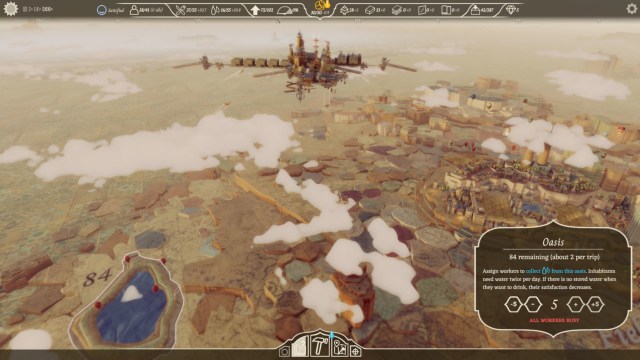 These materials then become one of the core driving factors to travel, because once an area’s materials are depleted, it’s time to move along to a new area. Throughout these travels, you begin to come across both small and large communities on the ground. The smaller cities act as resident feeders for your own city. Recruiting these people will help address the ever-expanding needs of the skytropolis, but it comes at the cost of now needing more housing and having additional mouths to feed. Regardless of whether they are converting clay into building materials or gathering resources back on the ground, having plenty of residents is the engine that drives the evolution of any settlement.