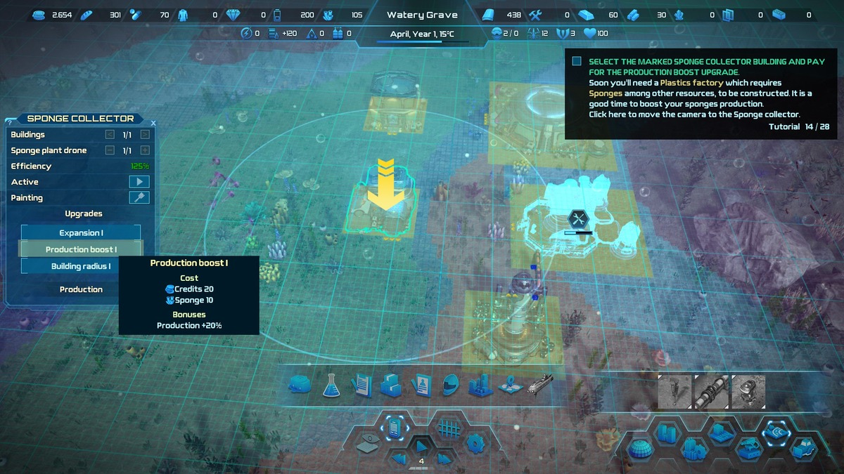 Only then do things get annoying as you’re required to build a sponge gatherer place to send a bot out to gather sponges, and then a plastic factory to turn sponges into plastics. This is the core gameplay loop, have fun.