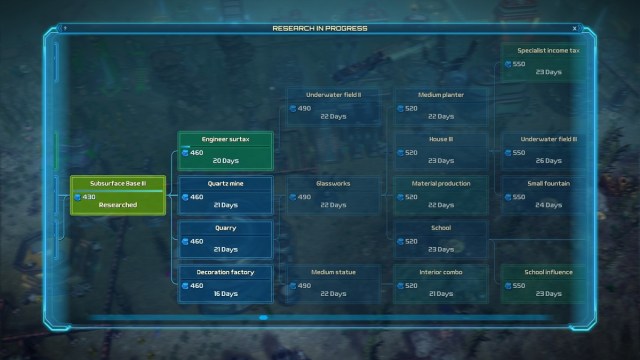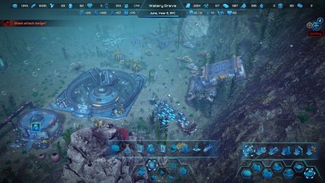 Most of the time, the only cost of research is your sanity. Let’s forget how divorced this system is from the rest of the gameplay. Let’s talk about creativity (or the lack thereof) instead. First of all, you’re never researching anything new and exciting. It’s all about giving you more busy work to keep your colony running. Any new factory is just a new supply chain link waiting to happen (or, rather, your existing infrastructure needing expansion) and none of it makes your game in any way interesting. At most, once you research guard posts, sharks will start threatening the colony — something that guard posts help against.