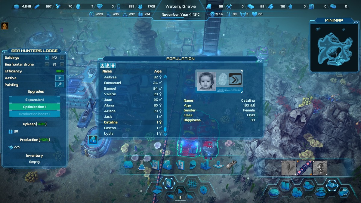 Words fail to describe how boring it all is. I’ve seen it all done in many other games and with much more purpose, but in Aquatico, everything is taken to the banalest extreme. For example, behold your citizens. Each technically has a profile with age, specialization, and sex. You may even know who they’re hooking up with.