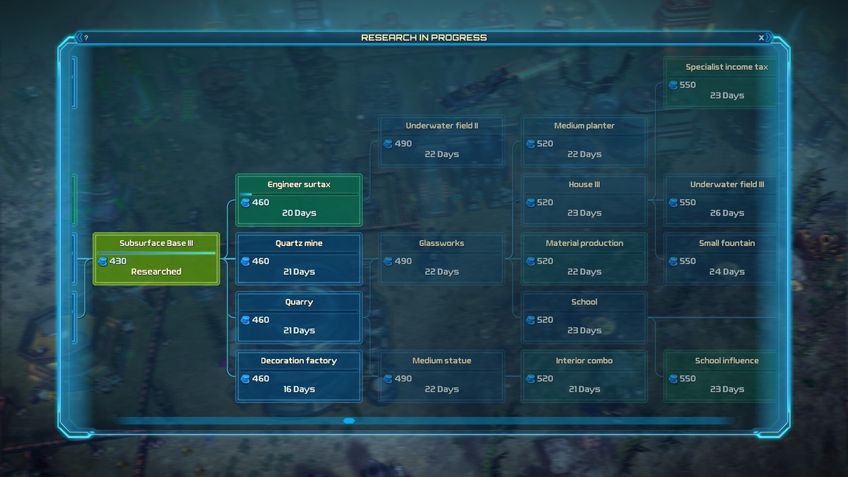Secondly, there’s literally no imagination in what you research. In this post-apocalyptic far-future underwater city builder, you need to research benches and potted plants. Small sculpture and medium sculpture are two different research subjects. Those aren’t even special structures that need to be adapted for use with diving suits, they just sit in the open in the living domes. The future people that have a 6:1 drone-to-person ratio running their settlement have forgotten what a bench is and need to pay money (to whom and for what?) to remember how to combine two planks into a raised seating arrangement.