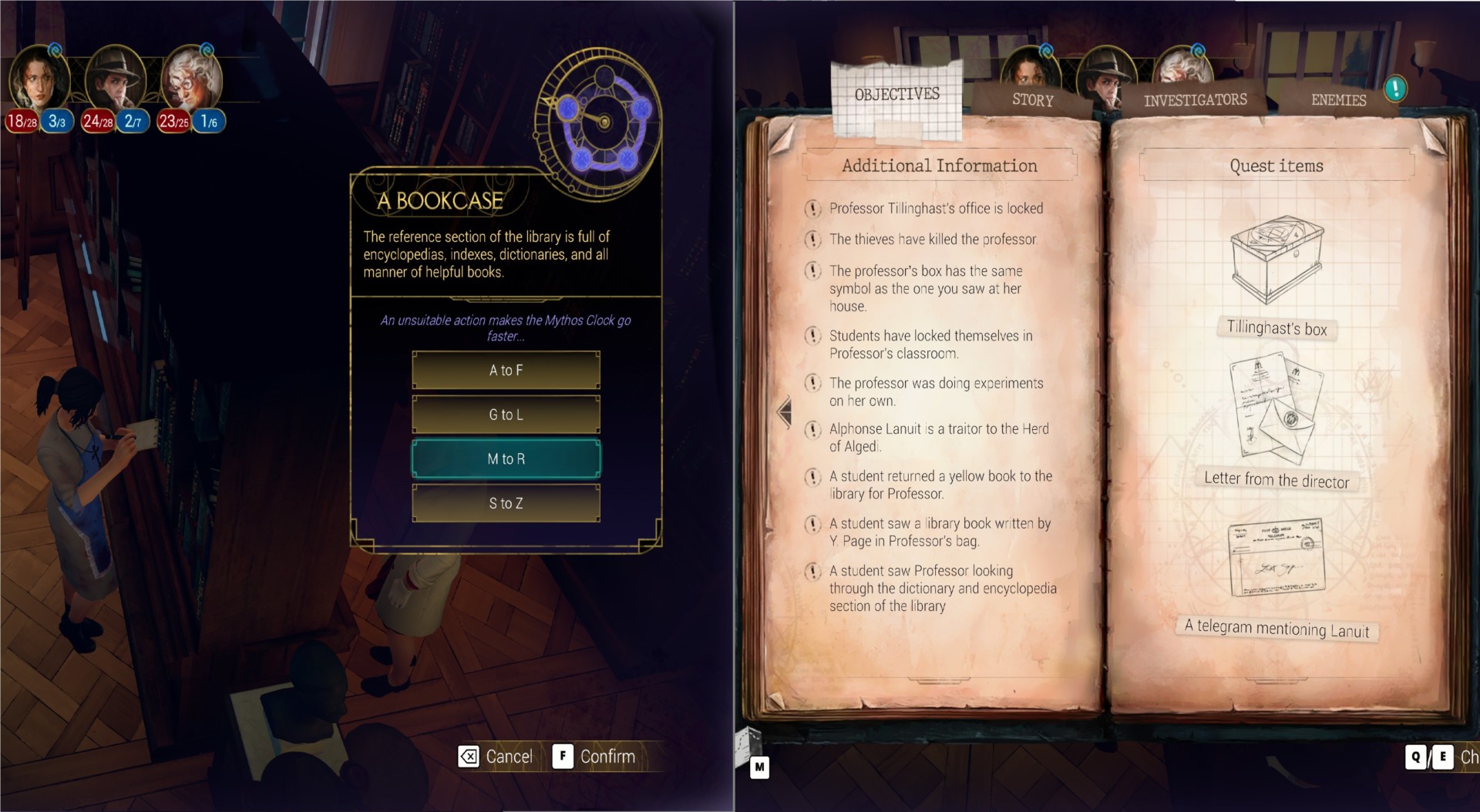 You can finish Arkham Horror: Mother’s Embrace within eight to 10 hours (a lot faster if you just ignore the clues on the side). Then again, it’s possible you may encounter several bugs and issues like I’ve also experienced during the course of this review. My problems included my main investigator getting stuck after checking a clue, as well as getting stuck because other NPCs moved next to them (and I had no way of getting out of a corner). There were also a couple of puzzles that made me scratch my head since the solutions felt completely unrelated to the clues I had gathered.