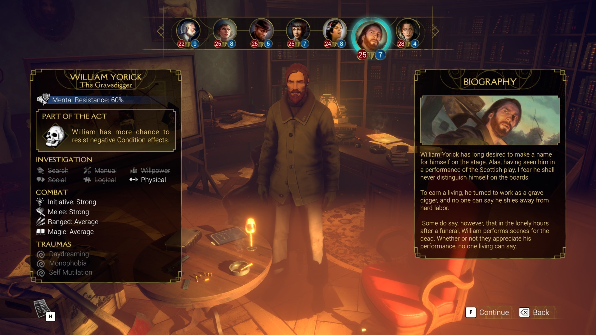 Meanwhile, “The Gravedigger” William Yorick has a perk called “Pact of the Act,” allowing him to resist negative status effects. Compared to Walters, he’s good with “physical” actions when conducting an investigation. Yorick also has high initiative and is strong in melee, but he’s average when it comes to magical and ranged attacks.