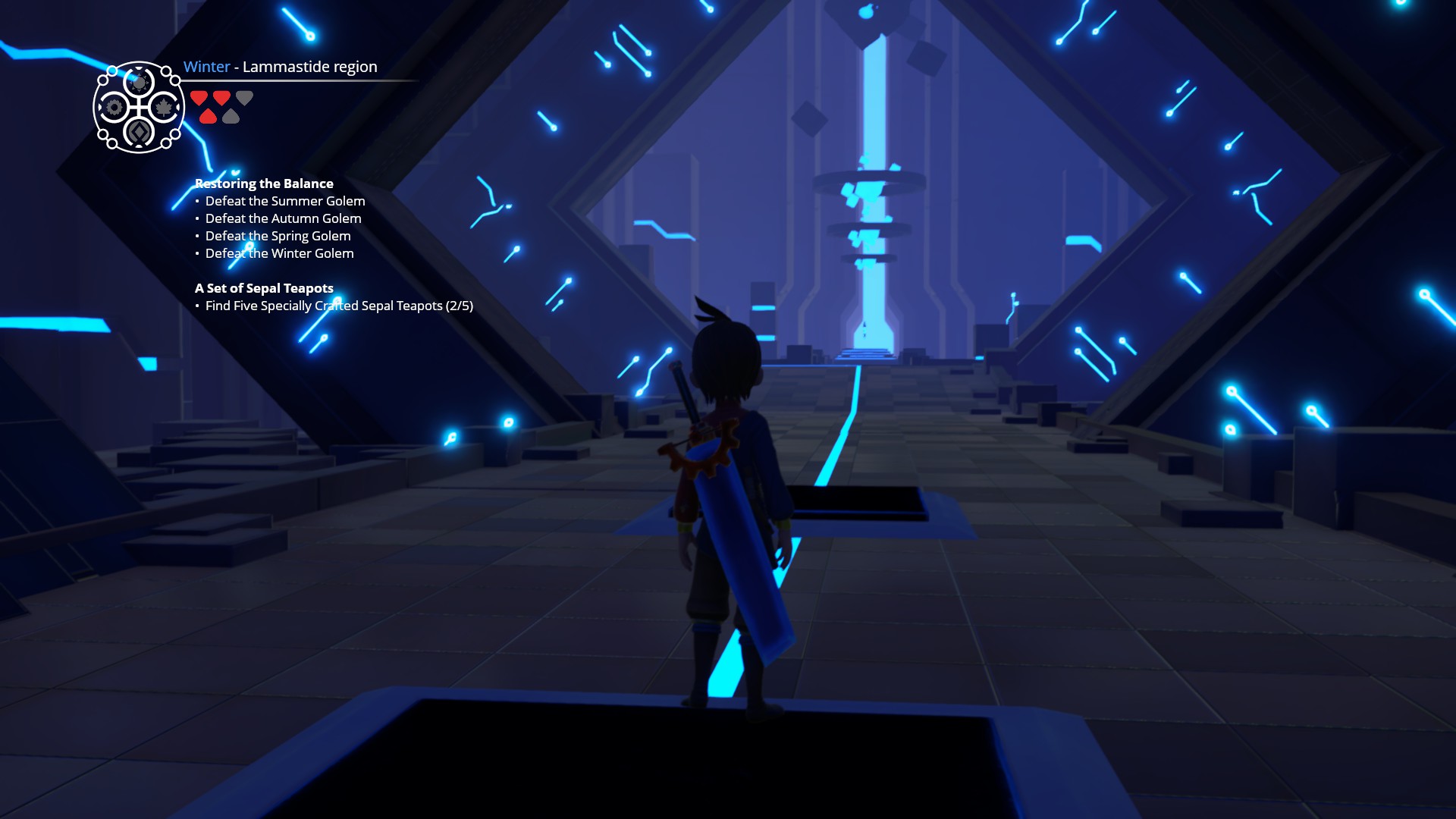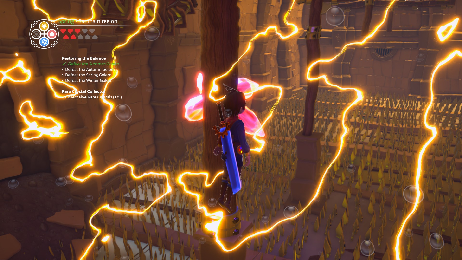 The main gameplay element that distinguishes the game from others is that Ary can create season spheres that alter the seasons of the space within them. Every location has its own season, and you can place spheres of the other three in the environment. These are introduced strangely as well. You grab the Winter sphere from Ary’s house and then go on a quest to find the next one. But after getting it, the game just gives you the other two. As far as the effects go, Winter spheres can freeze water and create ice platforms. Spring ones erase water and create vine pathways to walk and climb on. Summer and Autumn spheres, uh, don’t do anything unique at all. Once again, it feels like something was cut.