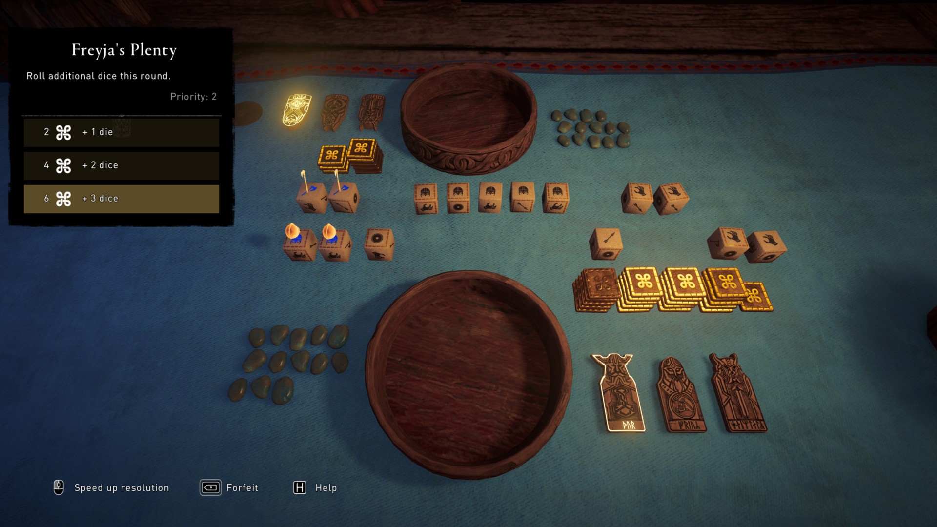 There’s also Orlog, a game of dice, with some magic thrown in the mix. I must say that I loved playing this and collecting the various God Favors from defeated opponents. Think of this as something akin to The Witcher‘s Gwent or Final Fantasy VIII‘s Triple Triad.