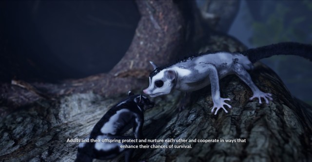 Away: The Survival Series gets off to a promising start by introducing a family of sugar gliders. If you’re not familiar with the adorable little buggers, they’re gliding possums that are mostly found in certain parts of Australia. They’re super cute. You play as a 6-month-old sugar glider as he follows his mother, who carries his baby sister on her back. But a vulture abducts them, so it’s up to you to follow it across the land and save your family. The plot is ridiculous and has set pieces such as sneaking through an underground tunnel past sleeping rats and jumping from tree to tree in a burning forest.