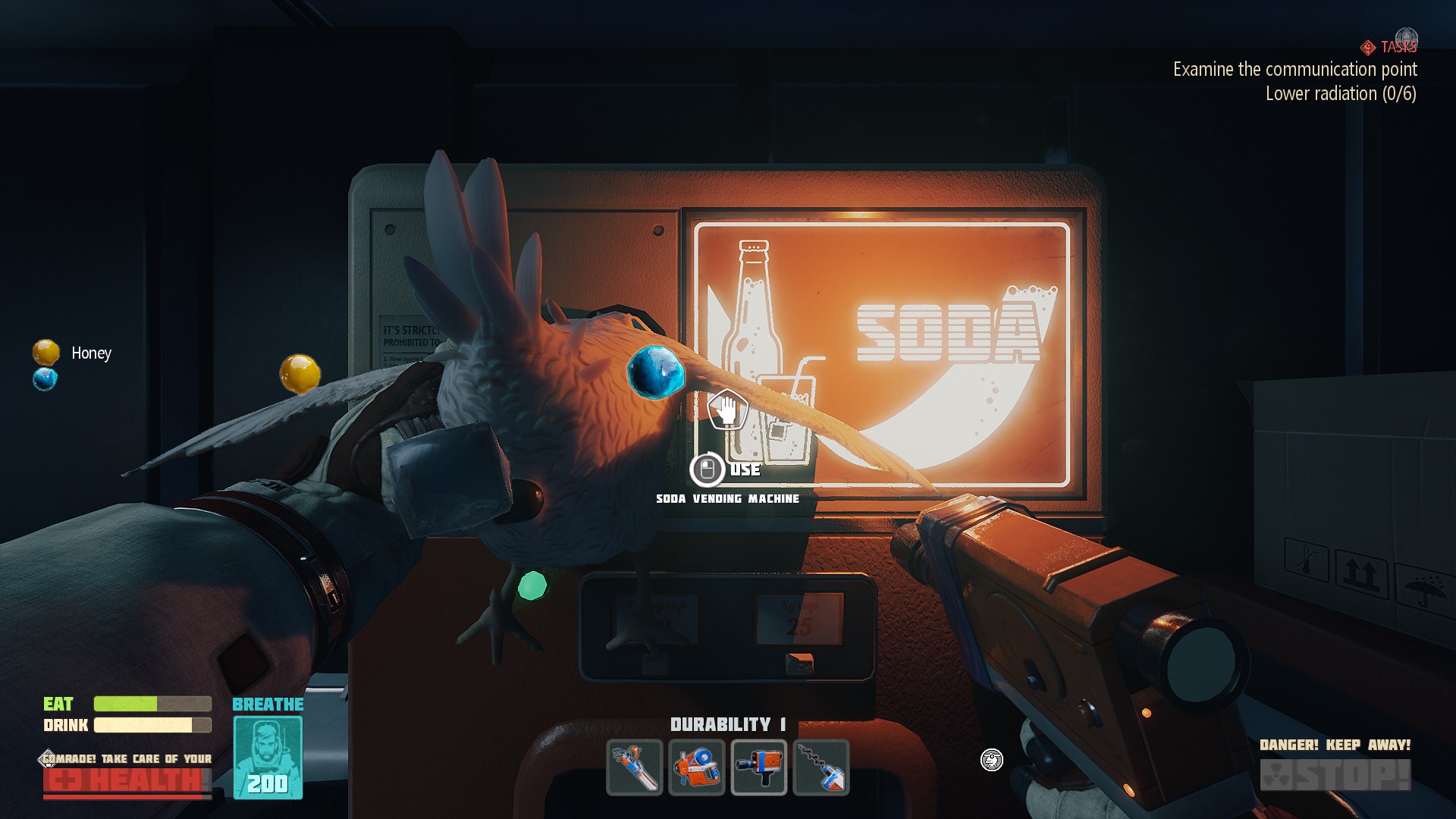 Just like the previous part, your inventory is all too small. And the game gives you far too many food and drink items. Keeping your hunger and thirst meters up is a no-brainer. Your base and everything are stuck in another map entirely. At one point, the game mocks you for thinking you can go back to it right away. Once you leave that sandbox, the rest of the game is like this, too. It’s more of a comedic walking simulator with crafting. Certain issues persist from the sandbox portion, but they’re intensified here due to the less interesting nature of running back and forth down the same corridors.