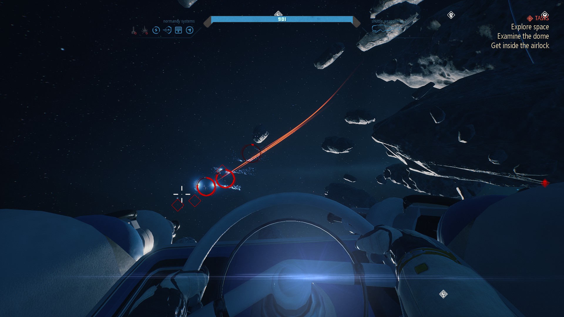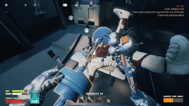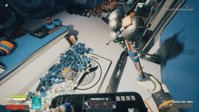 When the game first starts, you find yourself in a wrecked shuttle. You need to plug a leak with gum in the airlock and then you watch an instructional video (literally on VHS) before heading out into space. At first, you’ll only have 75 seconds worth of oxygen. You can’t last long in the vacuum, but you’ll need to gather little bits of metal to make a bludgeon for collecting more metal. Gradually, you’ll strike out and explore the surrounding area, all the while finding new materials and blueprints, followed by returning back to drop off the excess and craft new items and gear.
