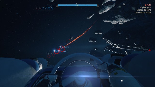 You’ll enter an area, grab resources until your inventory is full, go back to the ship to drop them off, and then press onward. Then you’ll hit the icon, realize you have to craft something, and you run all the way back to your ship’s processor to make what you need. Finally, you’ll run back and use the thing. Rinse and repeat. At the end of one of these areas, I had to run back and forth between my ship and the last area twice. It’s egregious.